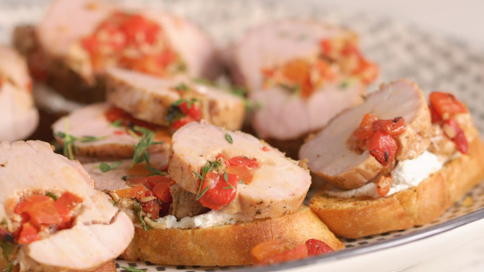 7. To serve, spread baguette toasts with goat cheese. Remove strings from pork tenderloin and cut into 3/8-inch-thick slices. Lightly spray rack in shallow roasting pan with nonstick spray. Place slices on top of goat cheese. Sprinkle with thyme, if desired.