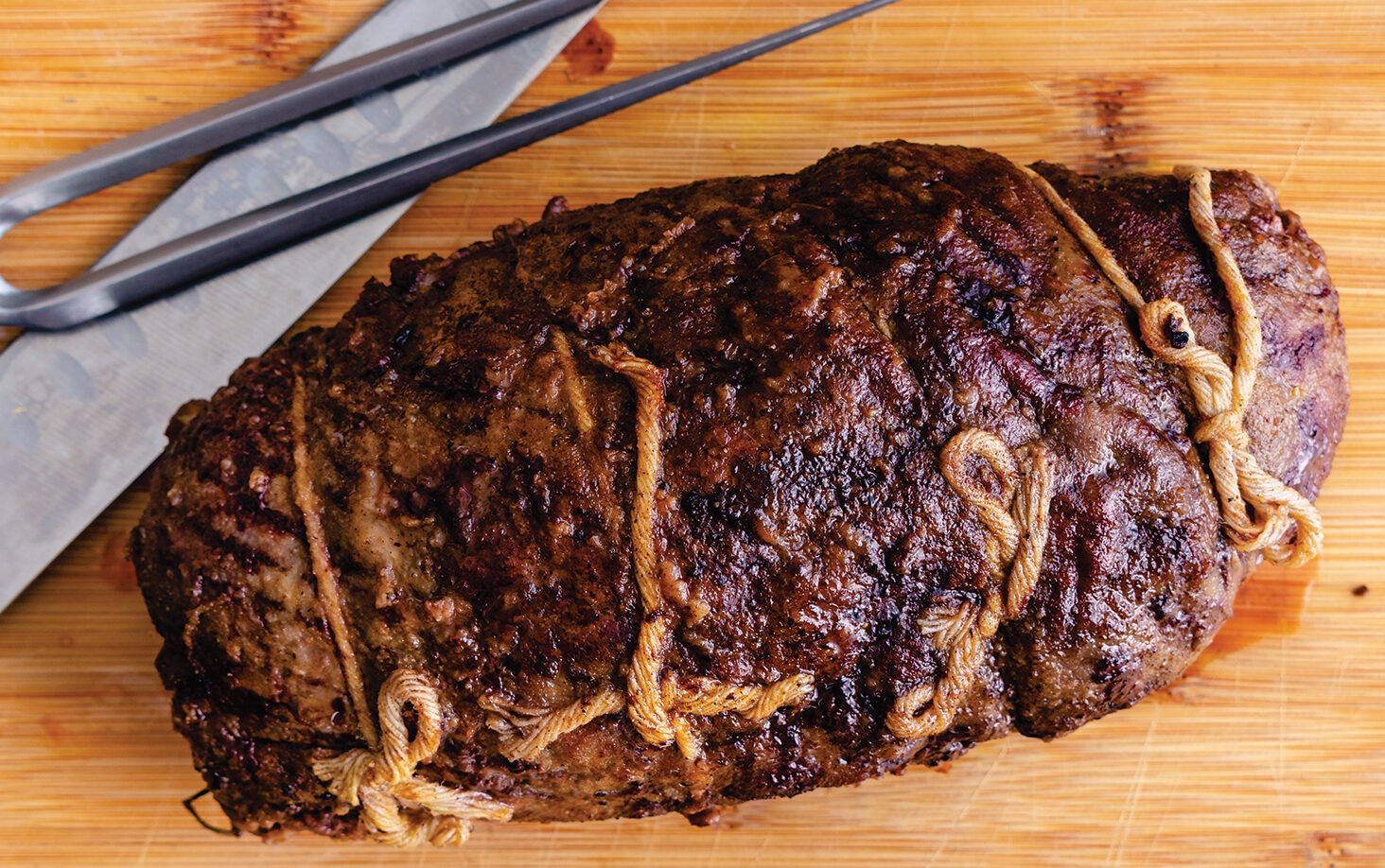 3. Carefully roll the steak away from you (the grain should run width-wise), tightening as you go until it is rolled into a cylinder. Let it rest with its seam-side down.