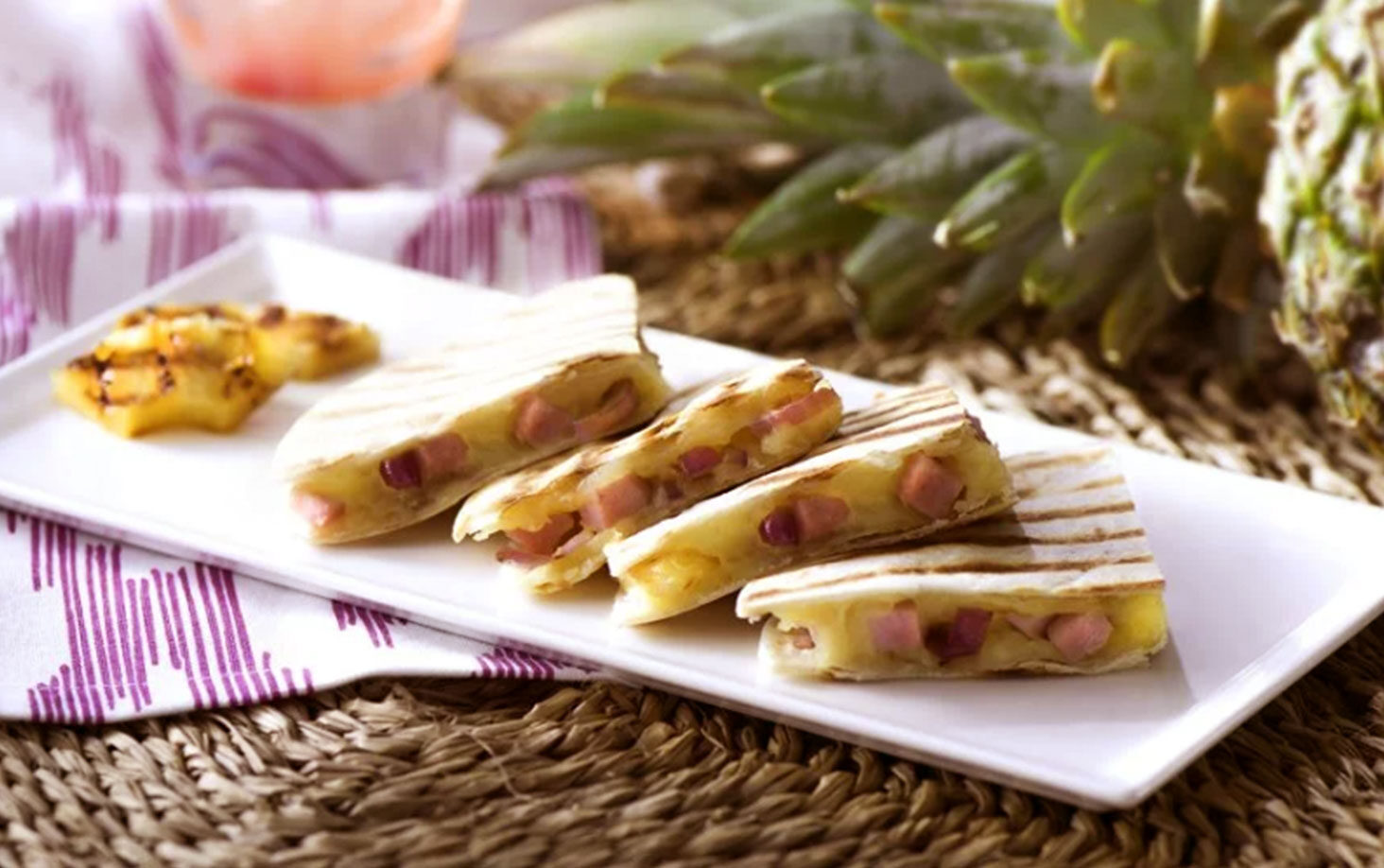 3. On the same griddle heat tortillas. Turn the heat to medium - low and heat tortillas for 15 seconds on one side, flip and add ¼ cup of cheese, half of the ham mixture, add ¼ cup of cheese, top with the other tortilla, press down, and cook for about 2 minutes until the cheese has melted and tortillas have the grilling marks. Flip occasionally so they don’t burn. Repeat with remaining ingredients. Serve and enjoy!