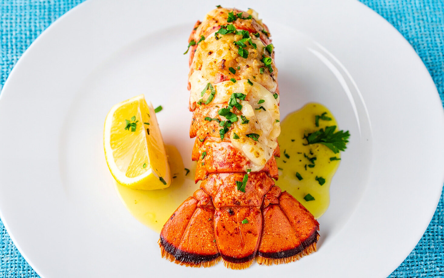- When the lobster is ready, transfer to serving plates and drizzle with the lemon garlic butter. Serve with the lemon wedges.