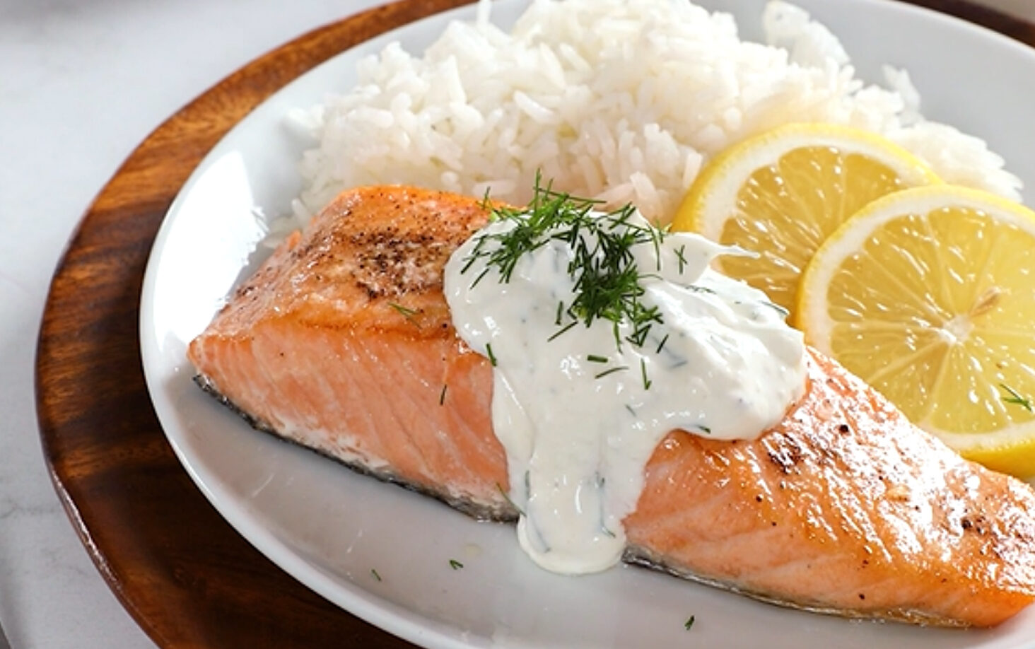 - Garnish salmon with dill. Serve with rice, lemon wedges and sour cream mixture.