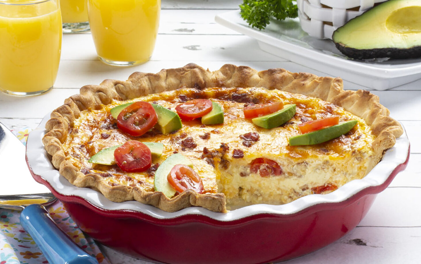 - Bake 45 to 55 minutes, or until center is set. Let sit for 10-15 minutes to firm up, then garnish with avocado wedges, cut into wedges, and serve.