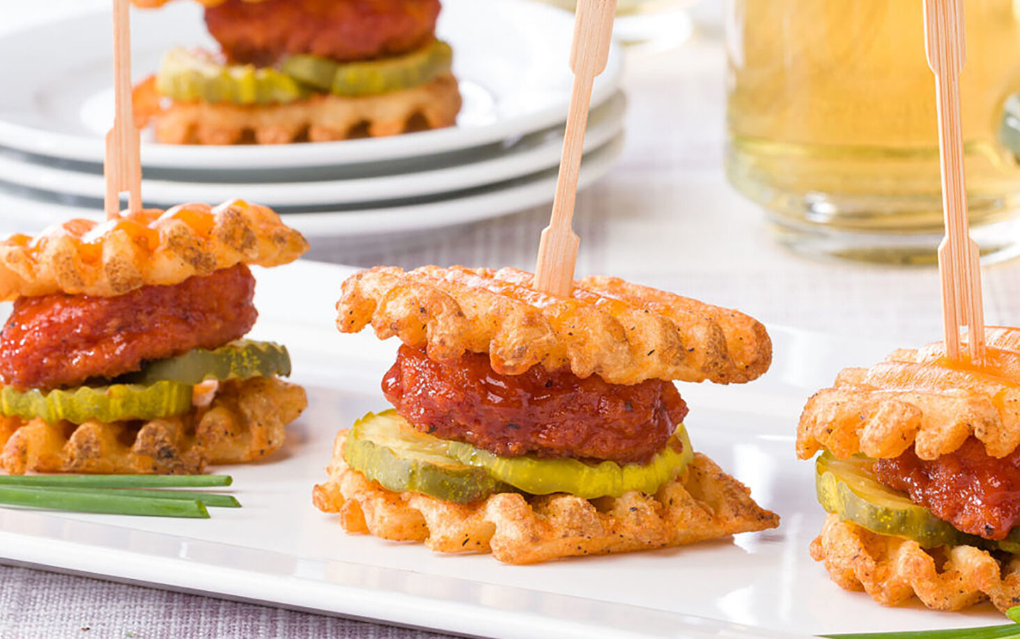 6. To finish, insert a toothpick into each of the BBQ chicken waffle sliders and serve immediately.