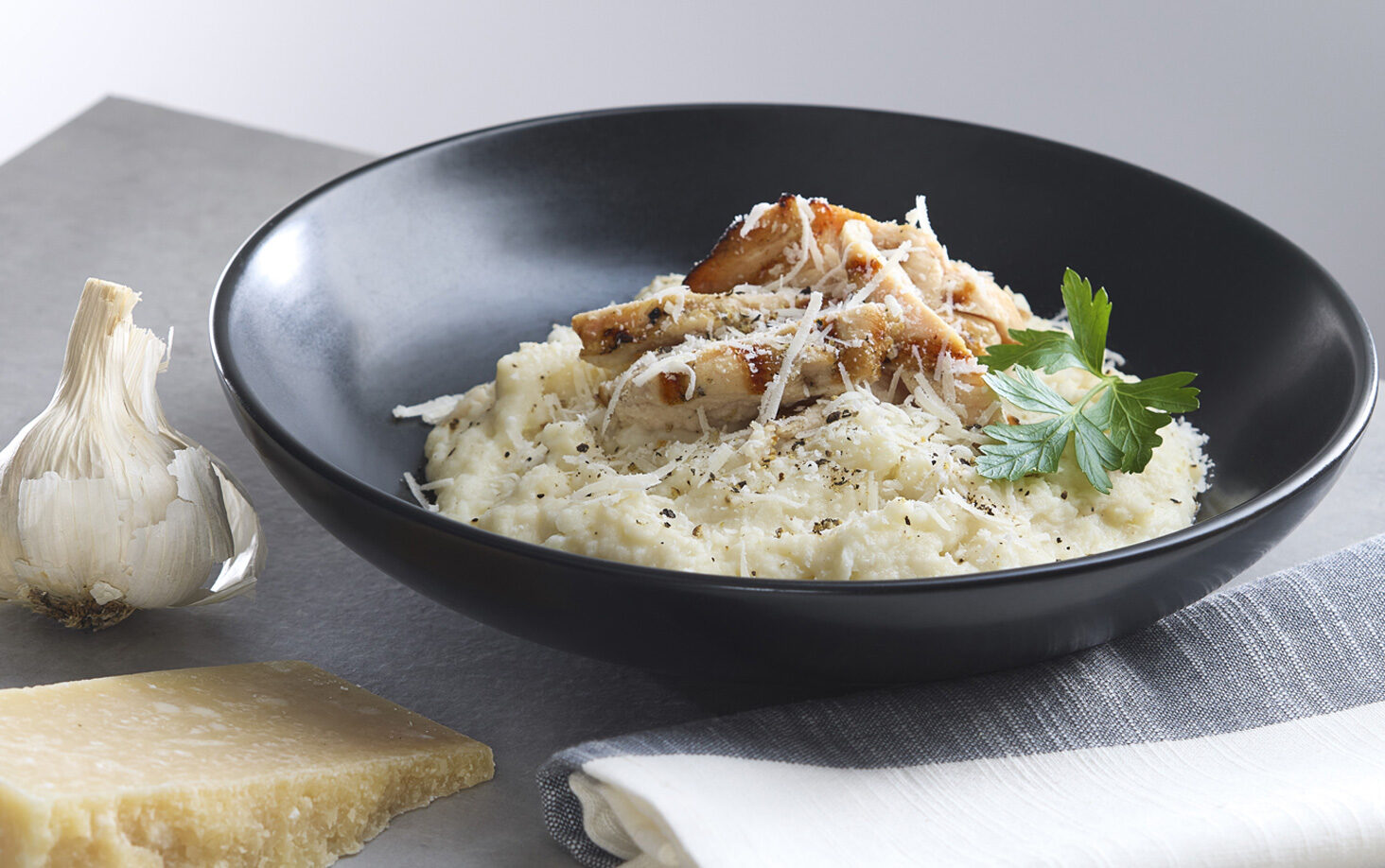 - Combine Main St Bistro Roasted Garlic Mashed Potatoes, garlic, heavy cream, butter, parmesan cheese, romano cheese, and chicken in a mixing bowl.